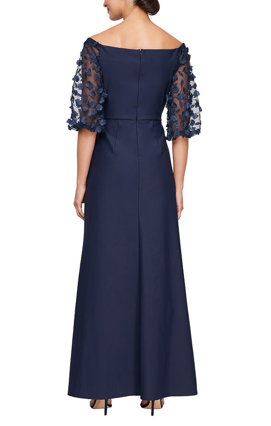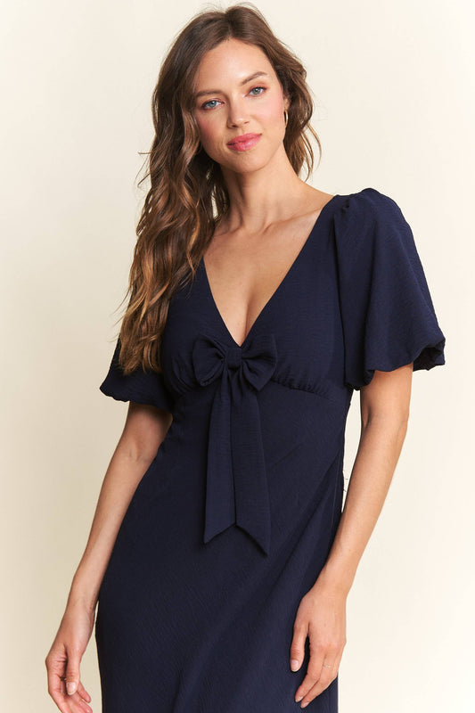 Navy Puff Sleeve with Front Bow Maxi Dress