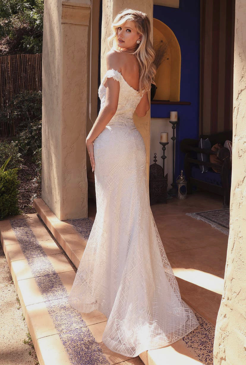 This classic bridal gown is cut to a flattering mermaid silhouette in a glittered crosshatch and scrolling floral design with a tonal underpinning. The off-the-shoulder sweetheart neckline is edged with hand cut lace that flaunts your décolletage while lace appliqué and glistening sequins decorate the bodice and hips. The fluted skirt flares out below the thigh to a floor-sweeping hem with horsehair trim and a graceful train that trails just behind as you walk