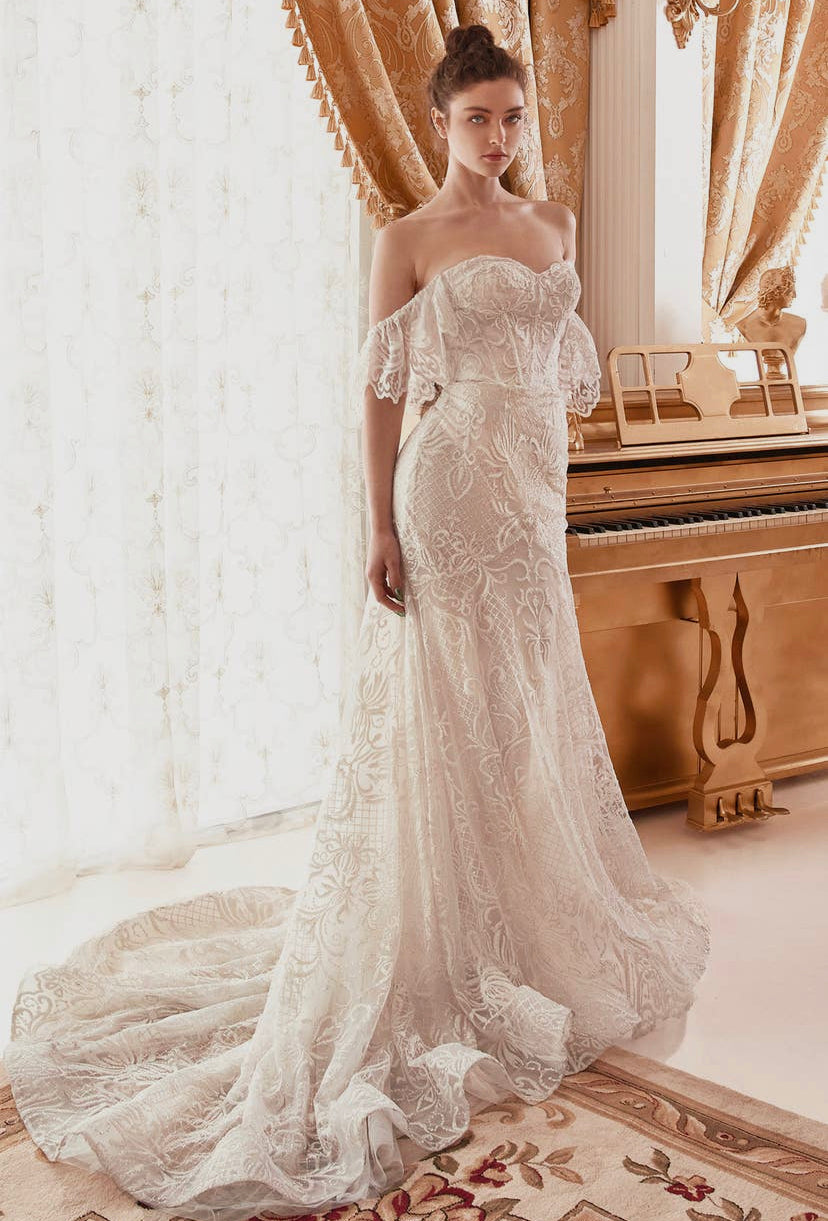 Dreams of walking down the aisle can now become a reality with this exquisite strapless mermaid wedding gown. Every inch of this off white, glitter baroque motif fabric shines with romantic elegance, making it perfect for any bride-to-be. A beautiful small rhinestone bow belt cinches the waistline to provide an extra element of femininity to contrast the daring sweetheart neckline and her off the shoulder detachable scallops straps. The boned corset bodice ensures a comfortable but stylish fit, while delicate long layers will follow you as you make your way down to say "i do". This is timeless style that speaks for itself on your special wedding day.
