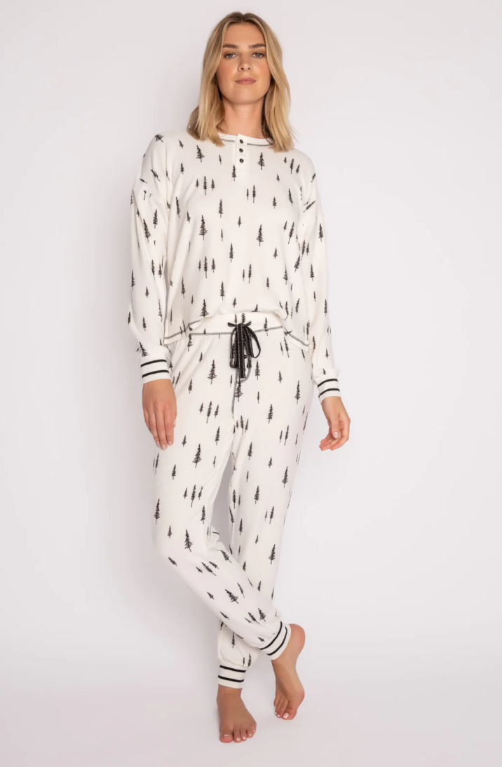 Inspired by the great outdoors - this print captured the heart of our whole team. Pajama set Henley top in the softest velour thermal. Modern & organic feeling all at once. Model is 5'8", wearing size small.