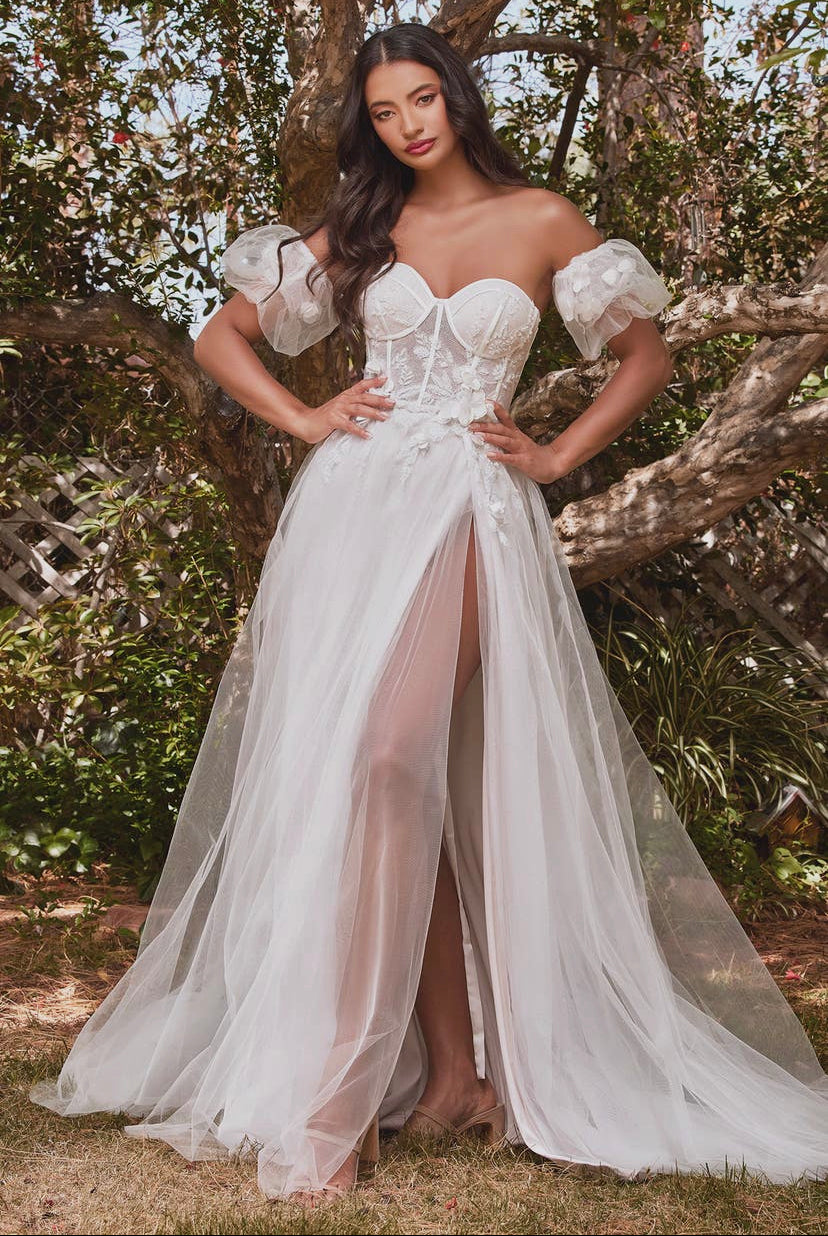 Blossoming with floral appliques this whimsical ball gown is layered in luminescent luxe tulle. The strapless structured bodice sits on the waistline attaching to optional off the shoulder puff sleeves adorned with beading and floral motifs.
