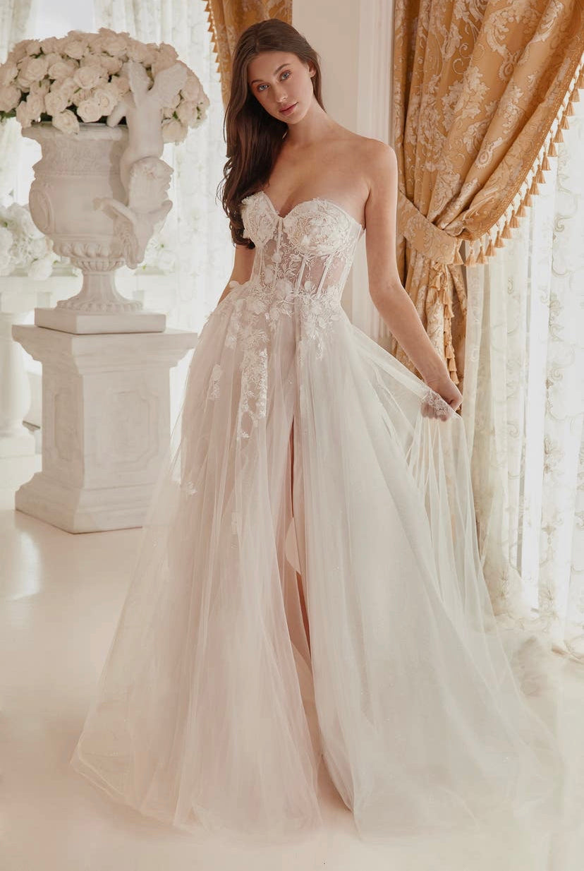 Welcome to your special day, glowing bride! This romantic wedding dress will have you feeling like a princess on your special day. The off-white material and sweetheart neckline showcase femininity, while the sheer boned bodice with lace appliques delicately contours your body for an absolutely stunning look. For added character, a leg slit in the front of the skirt gives you extra flair, and the center back zipper closure ensures that this bridal gown will stay secure all day long. Don’t wait any longer – say yes to this gorgeous strapless floral applique bridal ball gown and make some happy memories!