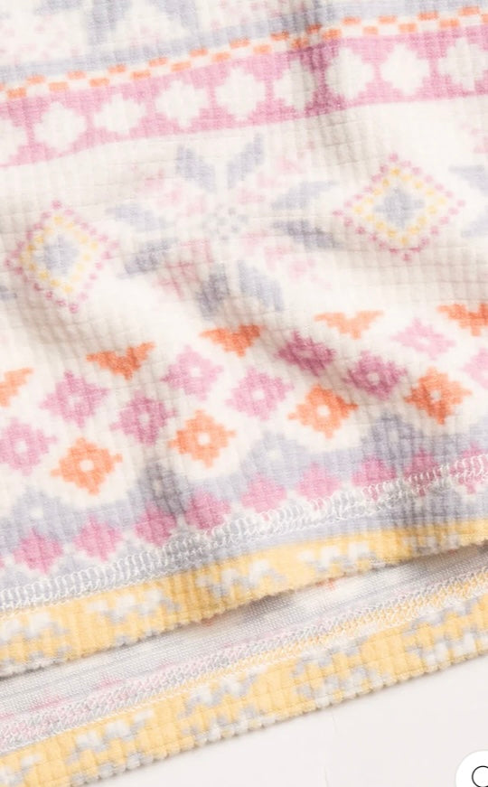 The ultimate fair isle pajama set in the softest velour thermal. In sweet pastel hues, this jammie top & banded pant have fun trim & stripe details that feel like you've raided the candy store. Model is 5' 9", wearing size small.