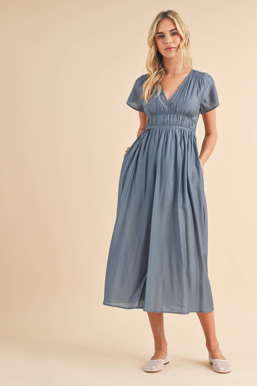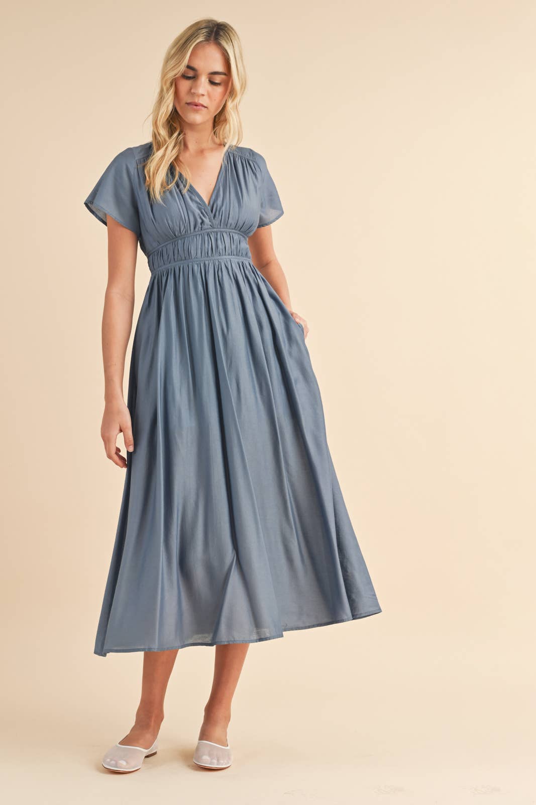 The Satin Flutter Sleeve Midi Dress is the epitome of effortless elegance and romantic charm. Its soft, lightweight rayon-blend satin material drapes gracefully, crafting a timeless silhouette that exudes comfort and style. Delicate flutter sleeves add a touch of feminine flair, while the smocked back waist ensures a flattering and flexible fit. A sophisticated back keyhole with a button closure and convenient side pockets make this dress both stylish and functional. Fully lined, it offers a smooth and breathable feel, making it the perfect choice for any occasion.