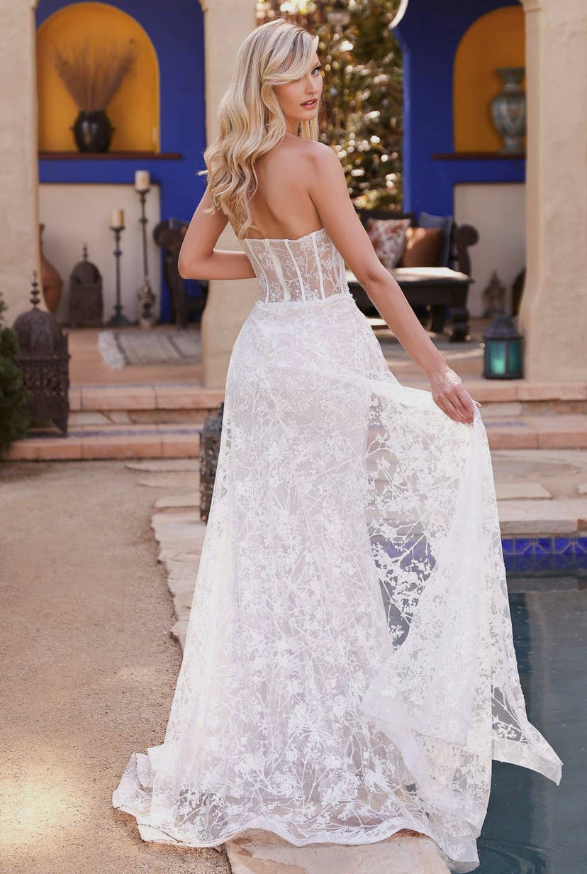 Tailored to a figure skimming fit, this strapless gown conjures an empowering elegance. It’s rendered in soft tulle with an all-over glittered design and degrade embroidered flowers. The corseted bodice is boned to offer flattering support and ensure that it stays in place. The skirt flares to a fishtail hem with a flowing tulle overskirt that brings a touch of drama to your grand entrance.