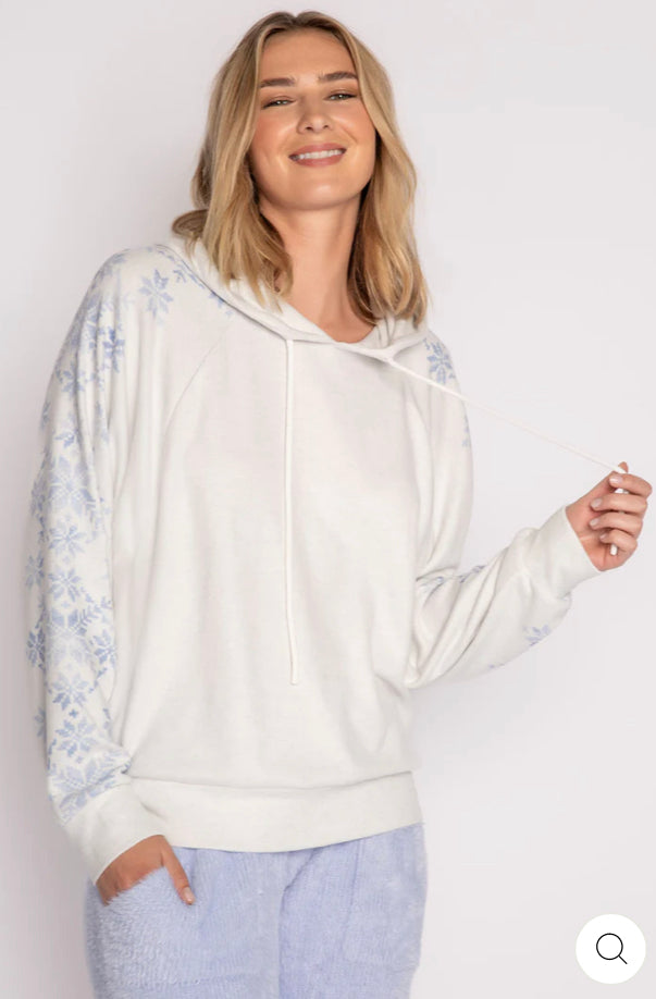 DESCRIPTION: Have your head in the clouds in our soft heathered pullover hoodie. Printed with pale blue snowflakes down the sleeves. Winter perfect. Model is 5' 9", wearing size small.