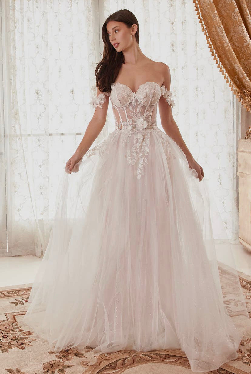 Introducing an unforgettable statement piece for your big day. This romantic, ethereal gown features an off-white floral applique layered ball gown with organza floral applique running from bodice to waist and a sheer boned corset bodice. With its delicate off the shoulder straps and sweetheart neckline, this dress creates a graceful look reminiscent of fairytale weddings. The combination of soft fabrics and intricate appliques makes for a breathtaking appeal. Plus, you’ll love how comfortable it is - you’ll feel like a princess as you dance the night away.